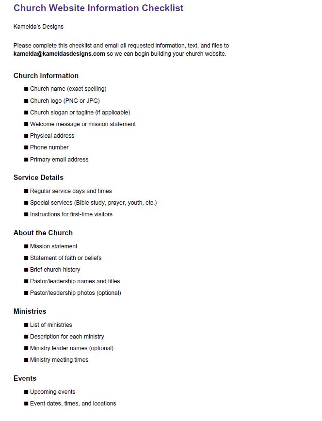 Below are some great documents to help you get started on your new website with me and stay on-task. Click on each pdf to download and print.